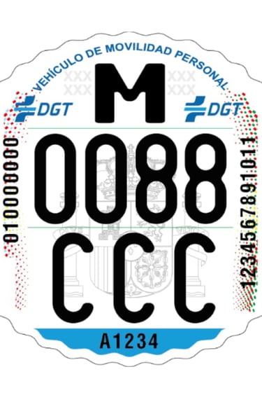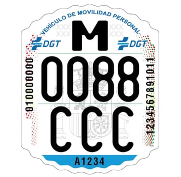 Matrícula de Patinete Eléctrico homologada con medidas reglamentarias (65 x 52,8 mm), fondo reflectante y sistemas anti-falsificación avanzados. Incluye número de serie, certificado y protección transparente. Rellena el siguiente cuestionario